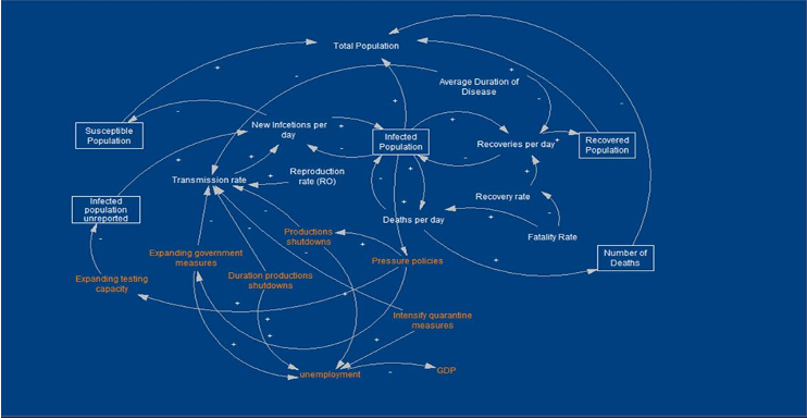 - Neben der Analyse der Corona-Infektionsverbreitung werden in unserem Modell auch verschiedene Interventionsstrategien (z.B. Production shutdowns, Grenzschließungen, Quarantänemaßnahmen, Social Distancing,…) und deren Auswirkungen auf den Verlauf der Verbreitung von COVID-19 untersucht.